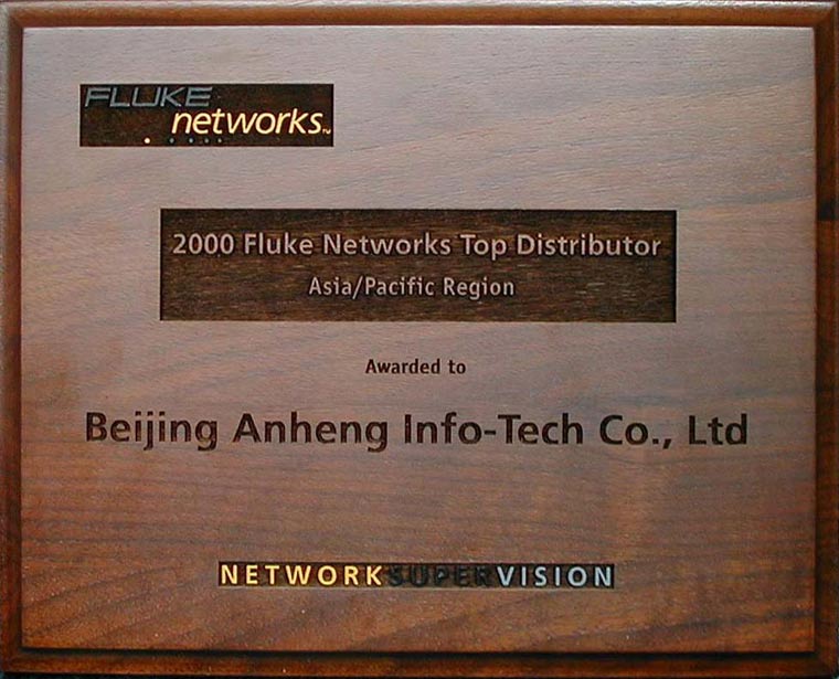 安恒公司自1994年与美国 Fluke 公司合作以来,一直以出色的增值服务连续多年得到 Fluke 公司的奖励。近来,安恒公司以其从市场到销售和对客户服务与支持的优异成绩,又赢得了 Fluke 国际部 2000年 “*佳销售”大奖。 (右图,点击放大)